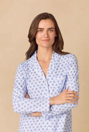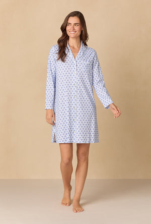 This classic Carole button front nightshirt is crafted in cozy 100% Cotton Jersey Knit, offering comfort and grace in equal measure. It features a notch collar with delicate satin piping and a chest pocket evoking timeless femininity. The full-length sleeves lend warmth and elegance, making this a perfect companion for the colder months.
