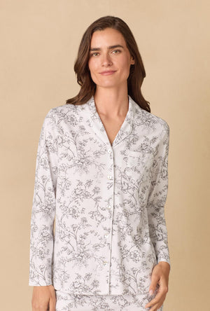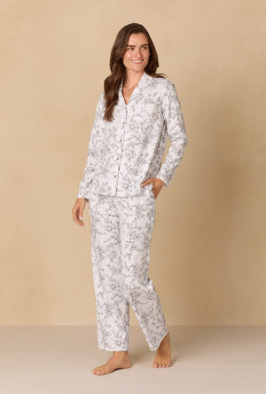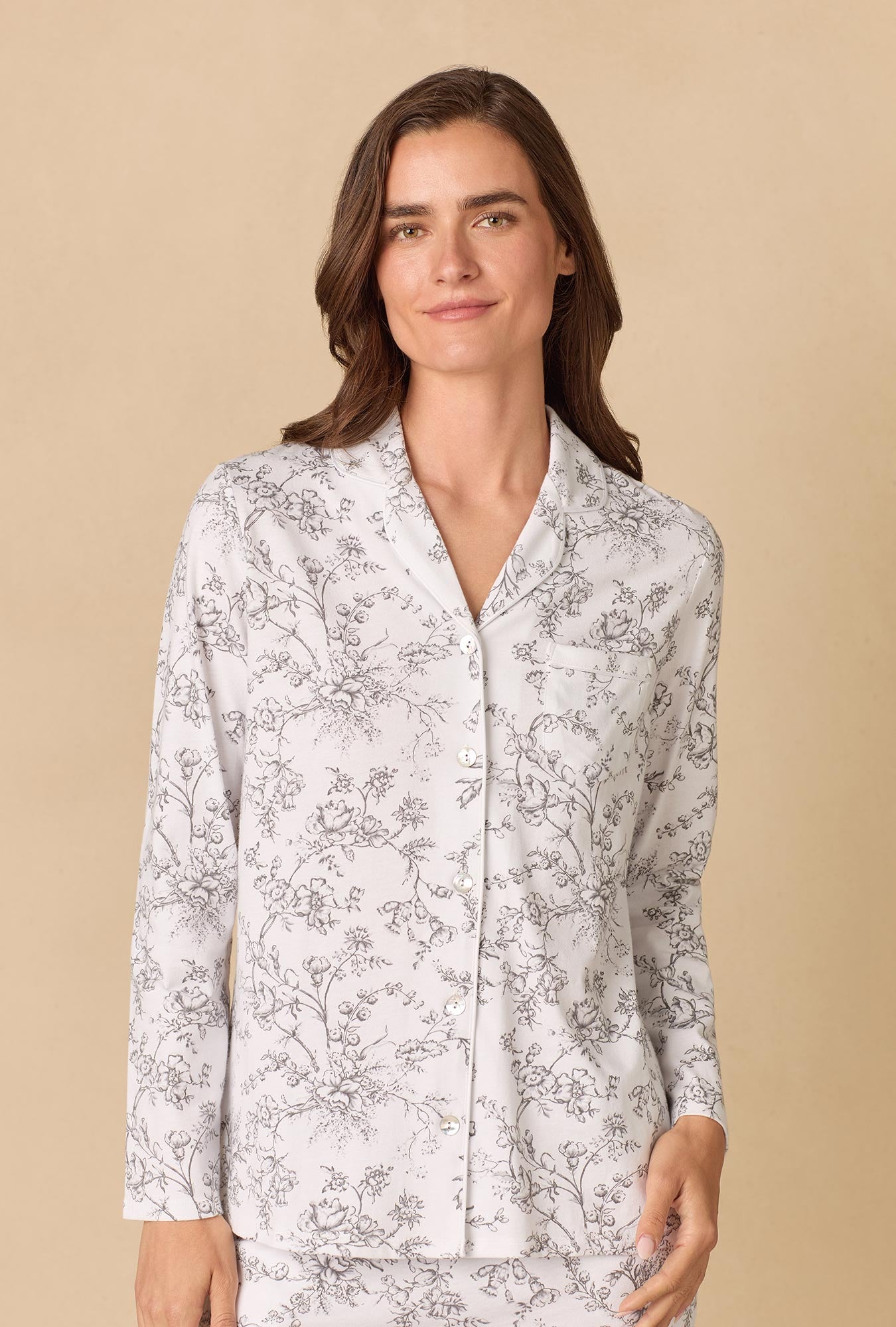 This timeless Carole pajama set is crafted in soft 100% cotton Jersey Knit for comfort that soothes day into night. The classic notch collar button front top features delicate satin piping and a chest pocket, lending a tailored touch to this feminine favorite. Paired with full-length pants finished with an adjustable drawstring waist and side seam pockets.