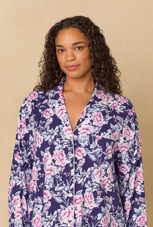 This classic Carole button front nightshirt is crafted in cozy 100% Cotton Jersey Knit, offering comfort and grace in equal measure. It features a notch collar with delicate satin piping and a chest pocket evoking timeless femininity. The full-length sleeves lend warmth and elegance, making this a perfect companion for the colder months.