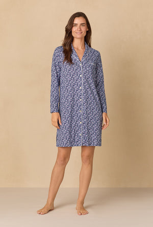 This classic Carole button front nightshirt is crafted in cozy 100% Cotton Jersey Knit, offering comfort and grace in equal measure. It features a notch collar with delicate satin piping and a chest pocket evoking timeless femininity. The full-length sleeves lend warmth and elegance, making this a perfect companion for the colder months.