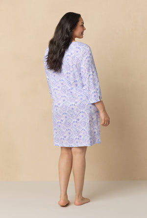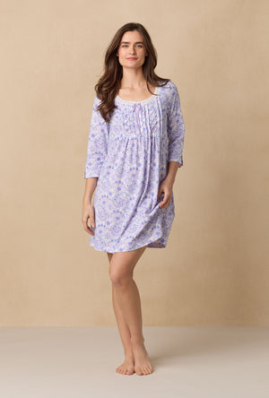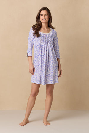 This lovely 3/4 sleeve short nightgown is made with classic design. Features a round neckline with beaded venise floral lace trim. Vertical pintucking details and akoya shell buttons at the yoke placket. Crafted in 100% cotton jersey knit