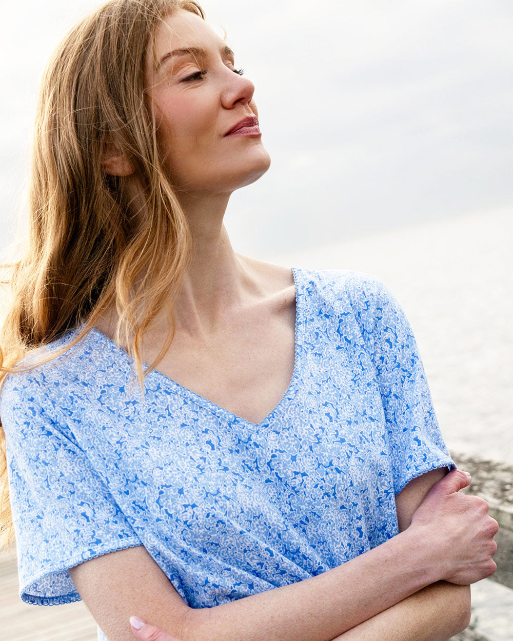 Soft coastal blues and delicate florals define this fresh spring collection, inspired by mornings near the water and quiet moments at home. Lightweight cotton fabrics offer breathable comfort, complemented by relaxed silhouettes that feel natural and easy. Gentle details and soft prints create a sense of calm throughout. Designed to move with you, beautifully and effortlessly.