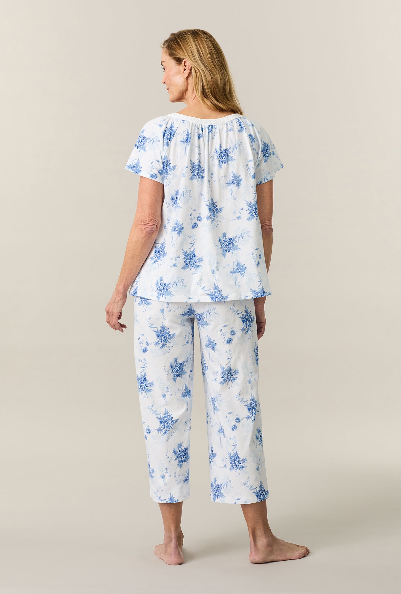 An elegant twist on everyday comfort, this women’s cotton pajama set features a shirred neckline with floral embroidery that adds quiet dimension and charm. The soft, breathable jersey feels smooth against the skin, and the Blue Depths Floral print brings a timeless navy-and-white floral that feels fresh for spring.