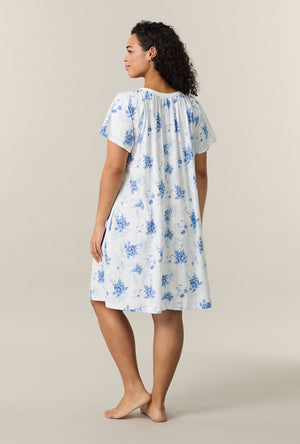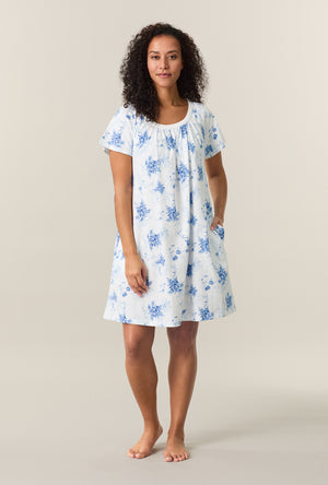 Delicate and feminine, this women’s cotton nightgown is designed with soft shirring at the neckline and finished with floral embroidery for a beautiful, elevated touch. The short sleeves and relaxed shape offer easy movement, while the breathable 100% BCI cotton jersey keeps you cool and comfortable. The airy white and blue floral print captures the gentle beauty of spring.